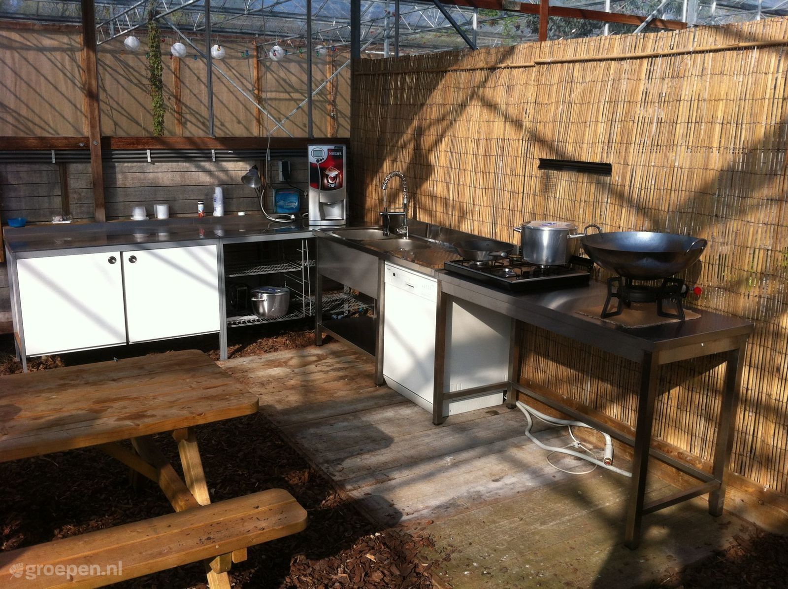Groepsaccommodatie Lutjebroek Onze accomodatie bestaat uit 5 grote 4 persoons safaritenten die naast elkaar staan in onze bloemenkas! De gevel aan de noordkant is geheel verwijdert zodat er glazen afdak is ontstaan. -